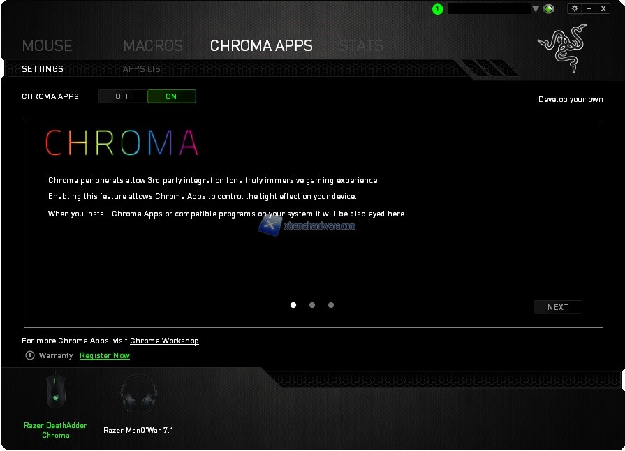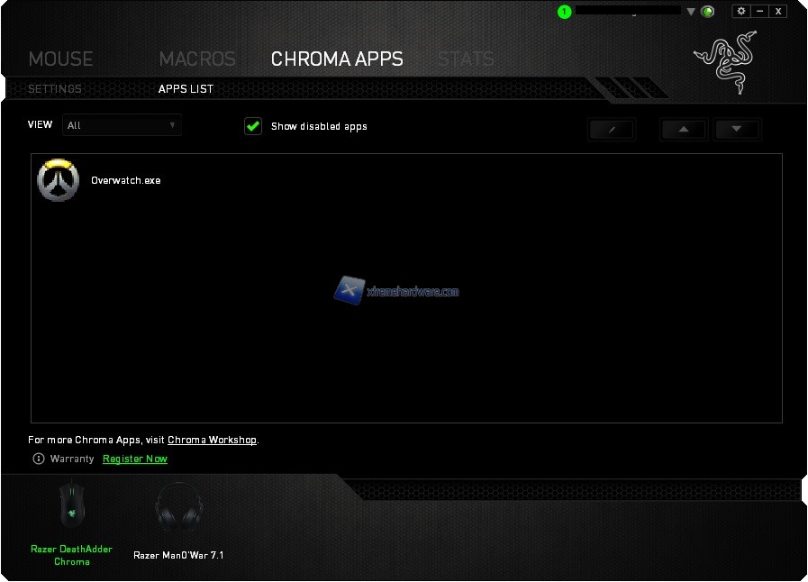 Menù ‘’Chroma Apps’’. Razer da quando ha creato il sito Chroma Workshop ha messo a disposizione una vasta raccolta di applicativi compatibili con il sistema Chroma nonché diversi effetti da scaricare e importare successivamente per i più famosi giochi tra cui il più recente Overwatch.