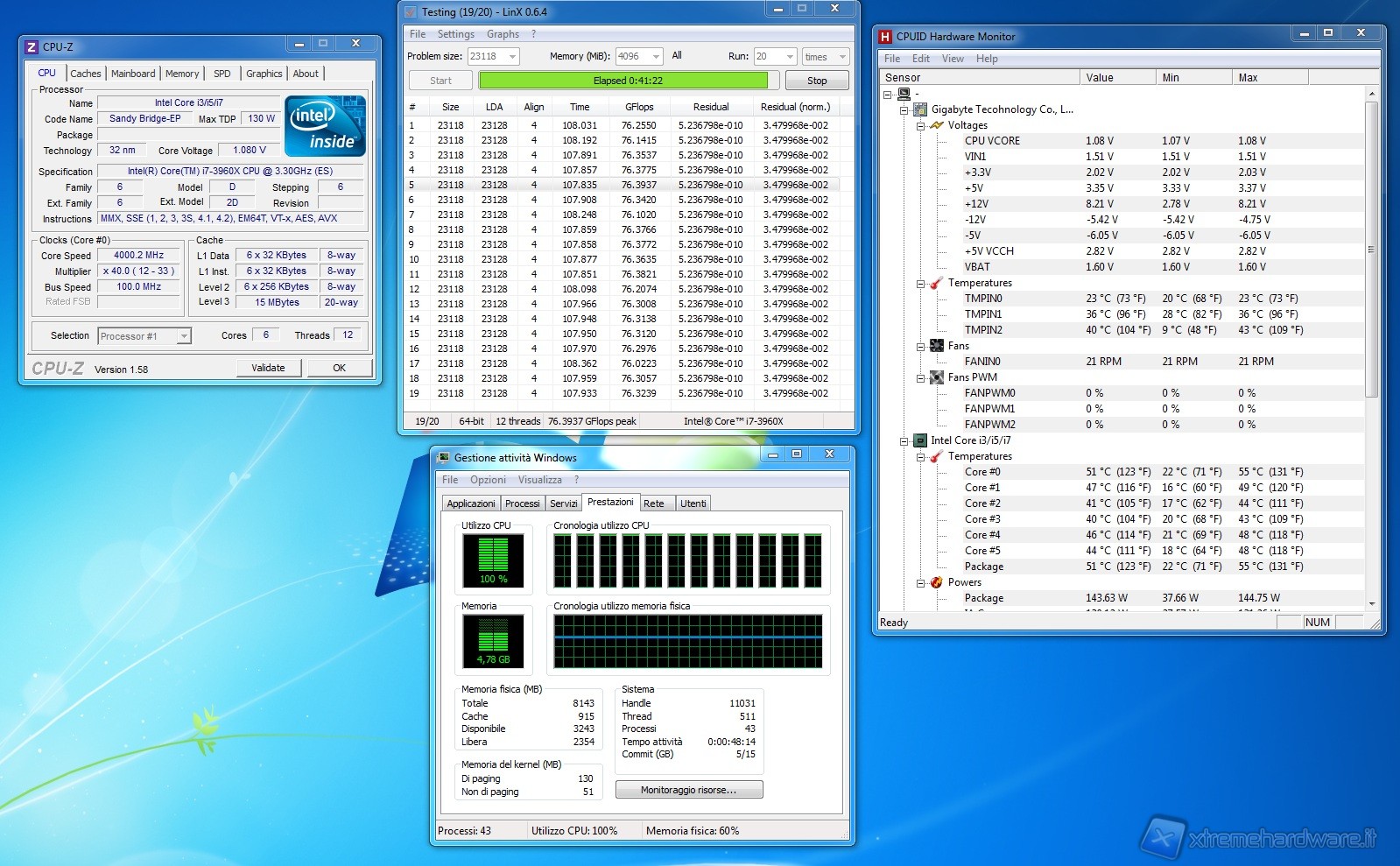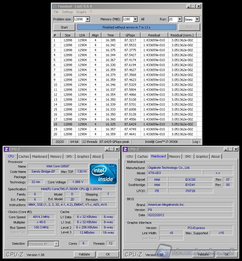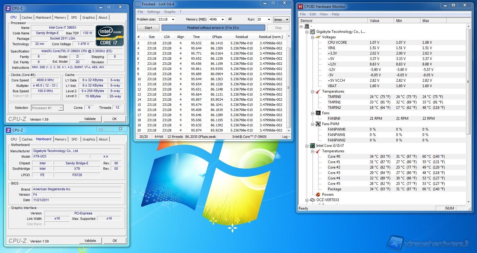 Abbiamo scelto LinX grazie alla sua capacità di portare il livello di carico alla CPU al 100 % e poter verificare fino a che frequenza è possibile salire e stabilizzare il sistema dichiarandolo Rock-Solid compatibilmente con le temperature raggiunte. LinX, ricordiamo, è basato sulle librerie Linpack con le quali computa equazioni lineari restituendo un valore in “GFlops” (Miliardi di operazioni in virgola mobile al secondo). Eseguire un Overclock vuol dire anche e soprattutto fare i conti con la temperatura raggiunta dal processore. In quanto modello di punta introdotto da Intel per il mercato Consumer e per giunta anche Esacore, l’i7-3960X è in grado di stressare efficacemente il sistema di alimentazione della X79-UD3. Vi proponiamo i risultati raggiunti tenendo conto che ci siamo affidati al Tool CPU-Z per il rilevamento dei voltaggi erogati.