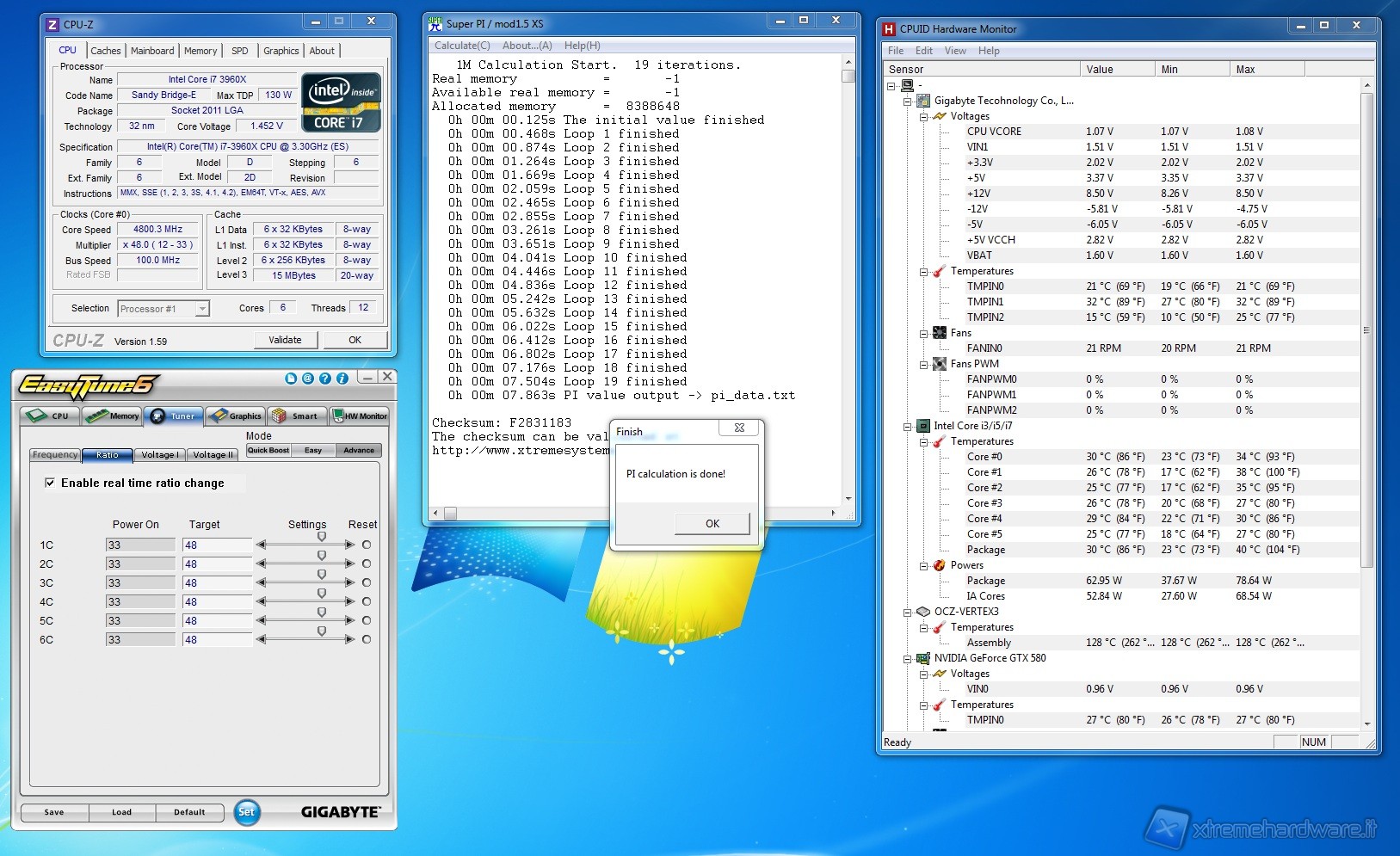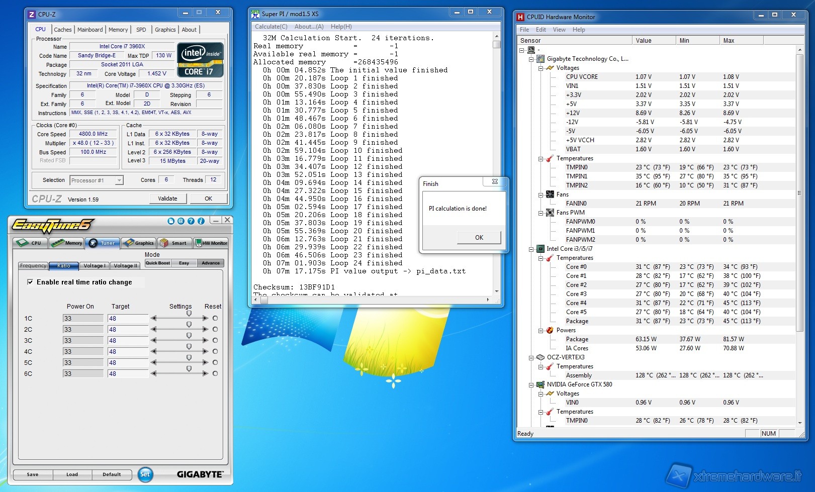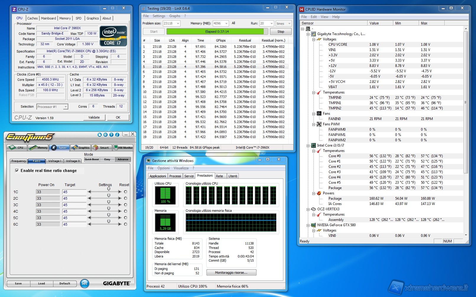 Abbiamo scelto LinX grazie alla sua capacità di portare il livello di carico alla CPU al 100 % e poter verificare fino a che frequenza è possibile salire e stabilizzare il sistema dichiarandolo Rock-Solid compatibilmente con le temperature raggiunte. LinX, ricordiamo, è basato sulle librerie Linpack con le quali computa equazioni lineari restituendo un valore in “GFlops” (Miliardi di operazioni in virgola mobile al secondo). Eseguire un Overclock vuol dire anche e soprattutto fare i conti con la temperatura raggiunta dal processore. In quanto modello di punta introdotto da Intel per il mercato Consumer e per giunta anche Esacore, l’i7-3960X è in grado di stressare efficacemente il sistema di alimentazione della X79-UD3. Vi proponiamo i risultati raggiunti tenendo conto che ci siamo affidati al Tool CPU-Z per il rilevamento dei voltaggi erogati.
