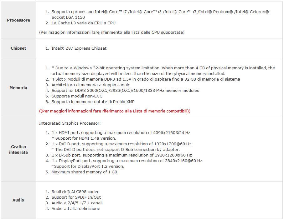 Riportiamo integralmente le specifiche della Z87X-UD3H, cosi come pubblicate sul portale del produttore