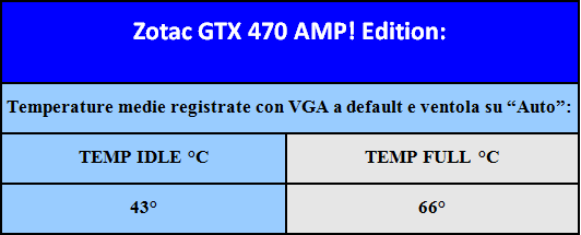 Dal punto di vista dei consumi, la sola GTX 470 consuma in full circa 215 Watt e in idle 85 Watt. Sono valori decisamente allineante alla caratura del prodotto.