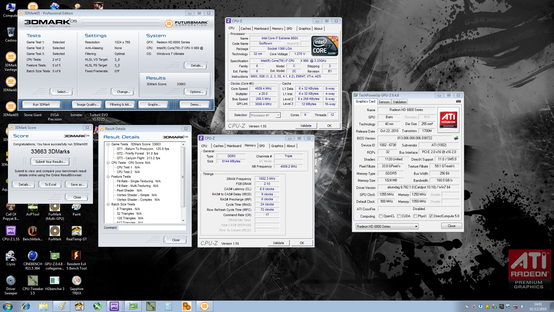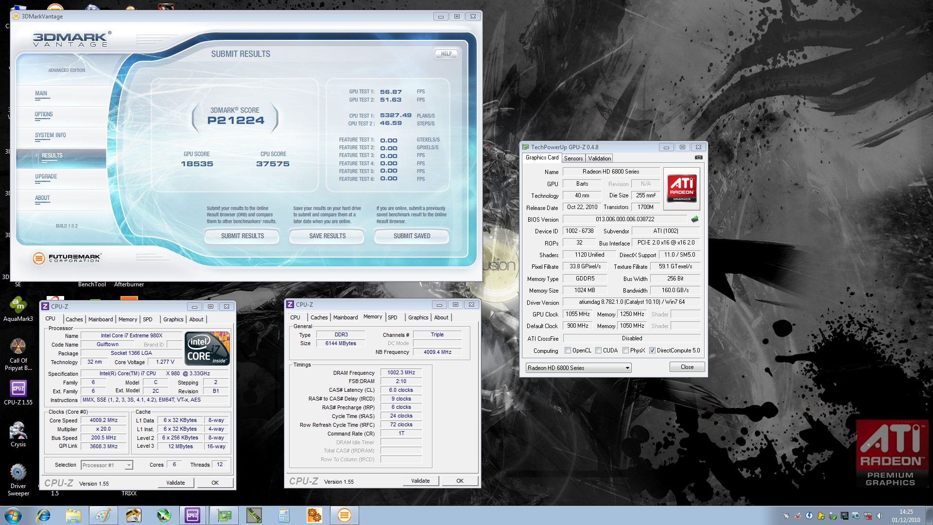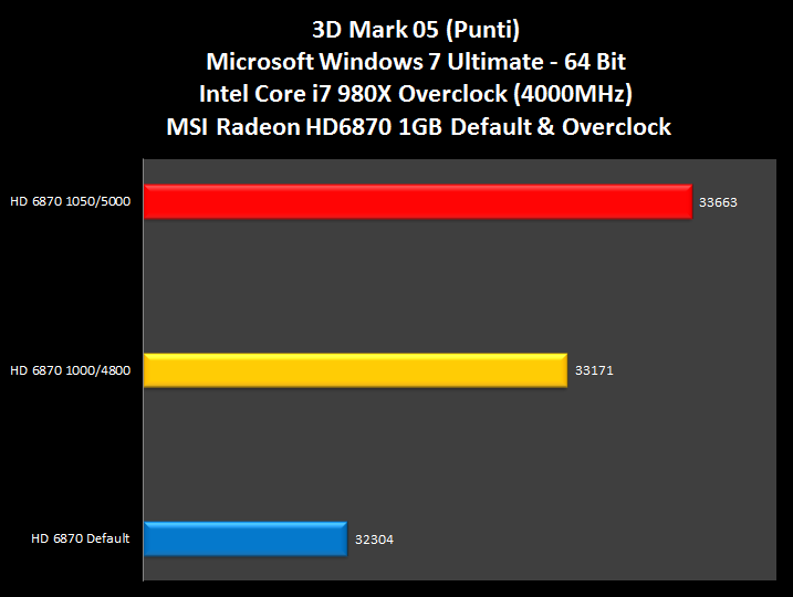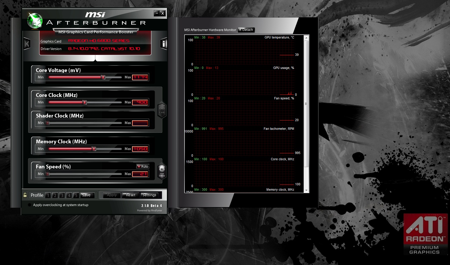La versione 2.1 Beta4 è perfettamente compatibile con le HD6000 “Barts” e permette, tra le altre cose, di incrementare il VGPU fino ad un massimo di 1.30v (sconsigliamo una tensione così elevata ad aria). In condizioni di raffreddamento standard, impostando una tensione sulla GPU pari a 1.25v (ricordiamo che di default è fissata a 1.174v sulle HD6870) e senza mettere mano alla tensione delle memorie, siamo riusciti a raggiungere i 1055/5000MHz, senza incontrare problemi durante l’esecuzione della maggior parte dei benchmark sintetici e dei giochi. Questo ha permesso di ottenere un buon incremento prestazionale, con una banda di memoria che passa da 134,4GB/s a ben 160GB/s. La ventola, al fine di contenere le temperature, è stata impostata manualmente al 60% della velocità, risultando abbastanza rumorosa.